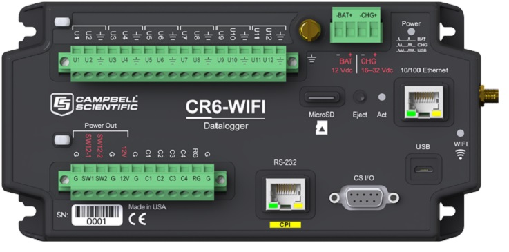 CR6数据采集器是一款强大的系统控制单元,集数据采集与系统控制等核心功能于一体,它在继承CSI的CR系列采集器数十年来的高品质的基础上,博取百家之长,包容并蓄,集成了microUSB口、Ethernet网络接口(WiFi选配),支持MicroSD卡扩展,同时保留了原有的高性能CS I/O、RS-232等接口,使这套数据采集单元具有非常丰富和完善的扩展性,能够支持众多类型的传感器和扩展模块/设备。